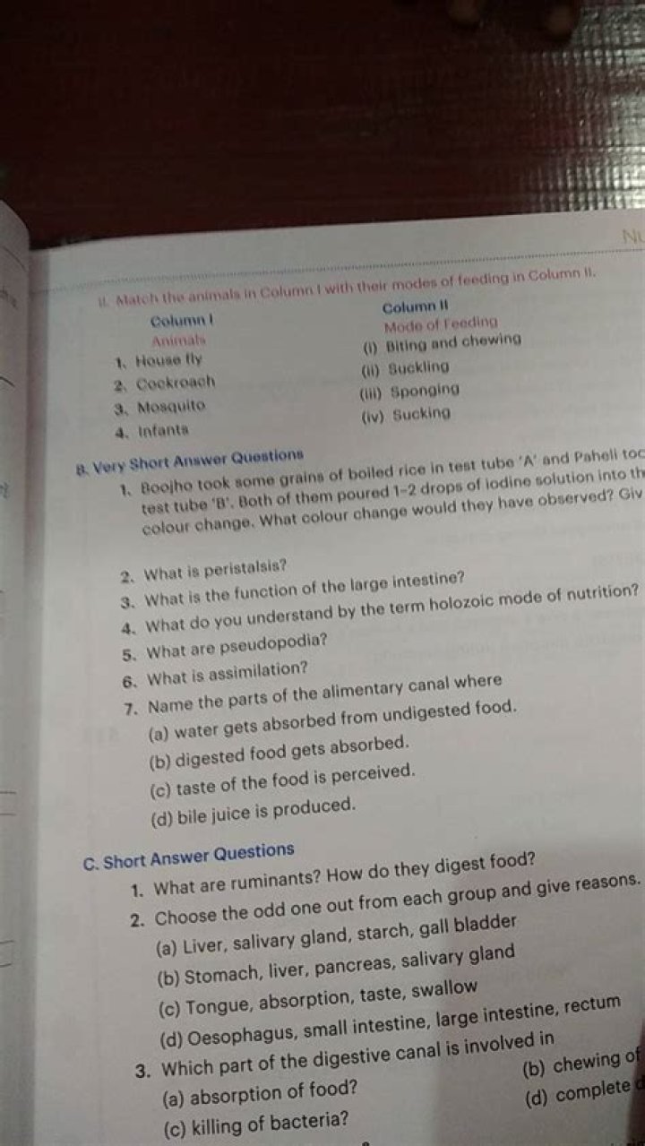 Answer : (i) Absorption of food : Small intestine. (ii) Chewing of food : Mouth. (iii) Killing of bacteria : Stomach.