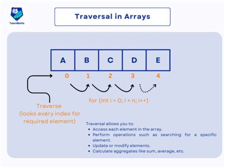 Algorithm Of Traversal Of An Array It is an operation in which element of the array is visited. The travel proceeds from first element to the last element of the array. Since the size of List is N , a count[ counter] will have to be maintained to keep track of the number of elements visited.